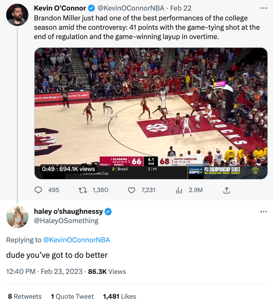 Kevin O’Connor, who covers NBA draft prospects, tweeted out Brandon Miller’s 41 point game a day after the police testimony. Many people, including Haley who I respect very much, found O’Connor’s tweets to be inappropriate. (It’s worth noting that O’Connor replied to his tweet acknowledging Miller’s presence at the crime scene.)